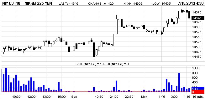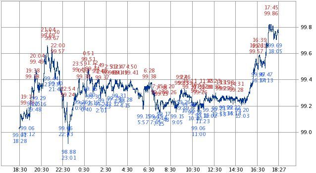 その後香港ハンセン指数などの伸び悩みを受けて日本時間15:30(シカゴ時間1:30)頃に日経平均は14,560円前後まで下落しましたが、日本時間16:00(シカゴ時間2:00)頃から日本時間16:30(シカゴ時間2:30)頃に1ドル99.2円強から99.6円弱へ、と日本時間17:15(シカゴ時間3:15)頃から日本時間16:45(シカゴ時間3:45)頃に1ドル99.5円前後から99.86円へ円安ドル高が進んだことを受けて、シカゴ日経平均先物も14,620円から14,675円まで上昇して12日の日経平均の終値よりも大幅な上昇となっています。