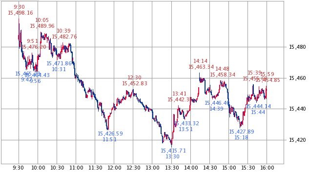NYダウは、7月米住宅建設業者指数、57と前月の51(改定値)から上昇し2006年1月以来7年半ぶりの高水準とアナリスト予想の52を、6月の米消費者物価指数(CPI)は、主にガソリン価格上昇で総合指数が前月比0.5%(前年比1.8%)上昇と前月の0.1%(前年比1.4%)から加速し、アナリスト予想の前月比が0.3%(前年比が1.7%)上昇を上回り、ゴールドマン・サックスの好決算を発表するなど好材料が揃ったにも拘らず、連騰を受け利食い売りが出ていることや金融政策の先行き不透明感に対する懸念などでNY時間16:00(シカゴ時間14:00、日本時間3:00)終値で15,451.85ドル(前日:15,484.26ドル、前日比-32.41ドル)と下落しています。