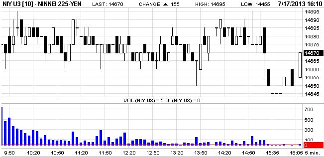 なお、NYダウより大きく上昇した理由は、米FRB議長の議会証言を好感してNYダウがNY時間11:51(日本時間22:51、シカゴ時間12:51)からNY時間12:14(日本時間23:14、シカゴ時間13:14)に14,438.12ドルから14,482.35ドルへ上昇したため、NY外為市場はドルが上昇して日本時間22:31(NY時間11:31、シカゴ時間12:31)から日本時間23:50(NY時間12:50、シカゴ時間13:50)に99.0円から90.0円へに0.2円の円安ドル高となりましたが、