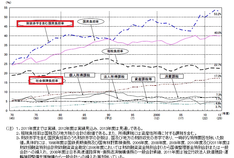 (添付図2: 政府への資金集中、すなわち国民負担率の増大状況。 バラマキ増大により国民負担率も急上昇。 つまり、役所経由の資金循環が膨張しており、実質、社会主義化しているうえ、バラマキ途中での中抜き利権も増えやすく、社会の不公正度が増しやすくなっている(増してる?))