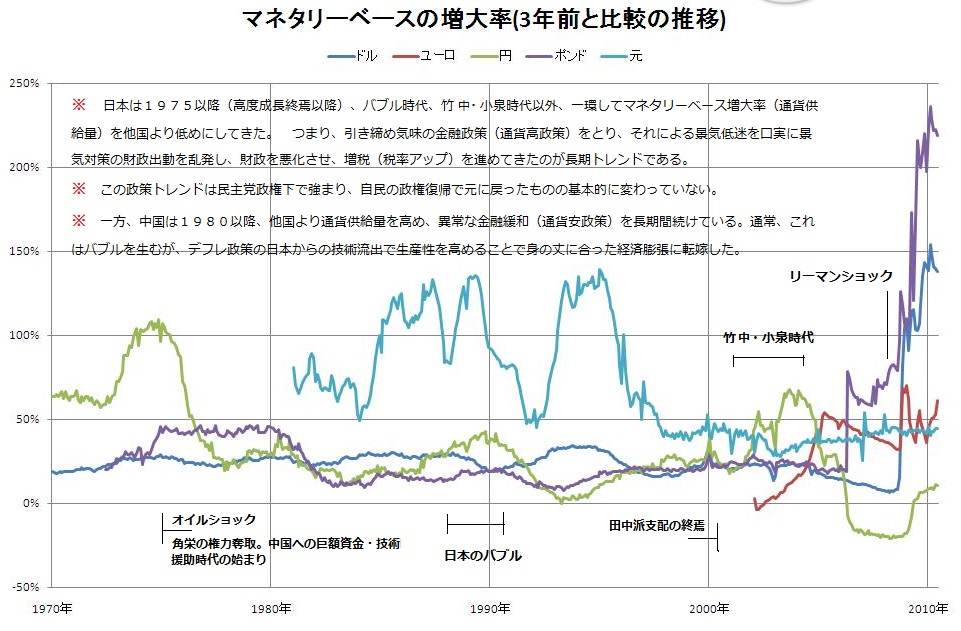 (添付図3: 各国のマネタリーベース増大(通貨供給量)の比較。 日本は1975以降、バブル期、小泉時代を除き一貫して低目。 つまり、通貨供給小=通貨価値アップ=労働価値(賃金)・物価・資産価値のダウン=景気低迷(デフレ的)、となっている。 1975角栄支配以降、官僚丸投げ政治が進み、利権増大&官僚支配強化=バラマキ拡大&増税推進、、に有利なデフレ的政策が取られやすくなった。 この結果、添付図1や添付図2のように成長率急落、国民負担率急増が起きた)