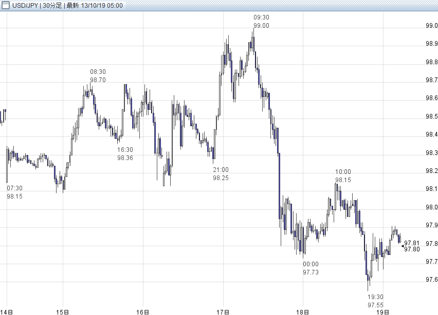 10月14日~10月18日の週。ドル円相場は1ドル=97.55~99.00円