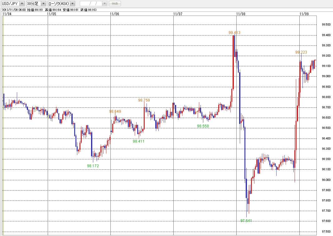 ↑11月4日~11月8日の週。ドル円相場は1ドル=97.64~99.41円