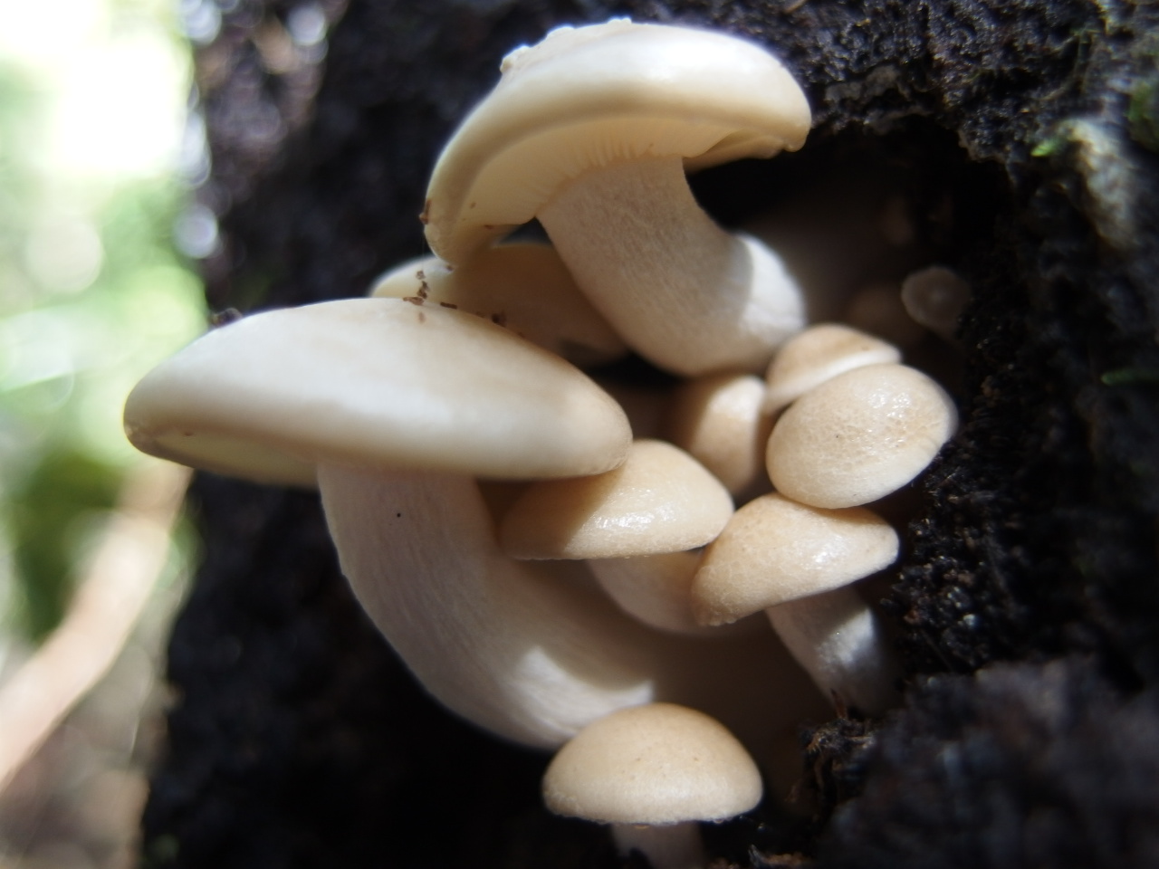 真っ白のヌメリツバタケを発見し高枝切り鋏の先端にカッターナイフを付けてブニルテープで固定して、その秘密兵器を使って高いところのキノコを落とす^^;