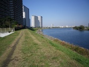 この写真じゃ分かりにくいけど、三菱の工場跡から丸子橋あたりまでは堤防が上下2段になっています。下の段は、品鶴線(昔の貨物専用線、今は横須賀線)から三菱の工場までの引き込み線の跡です。