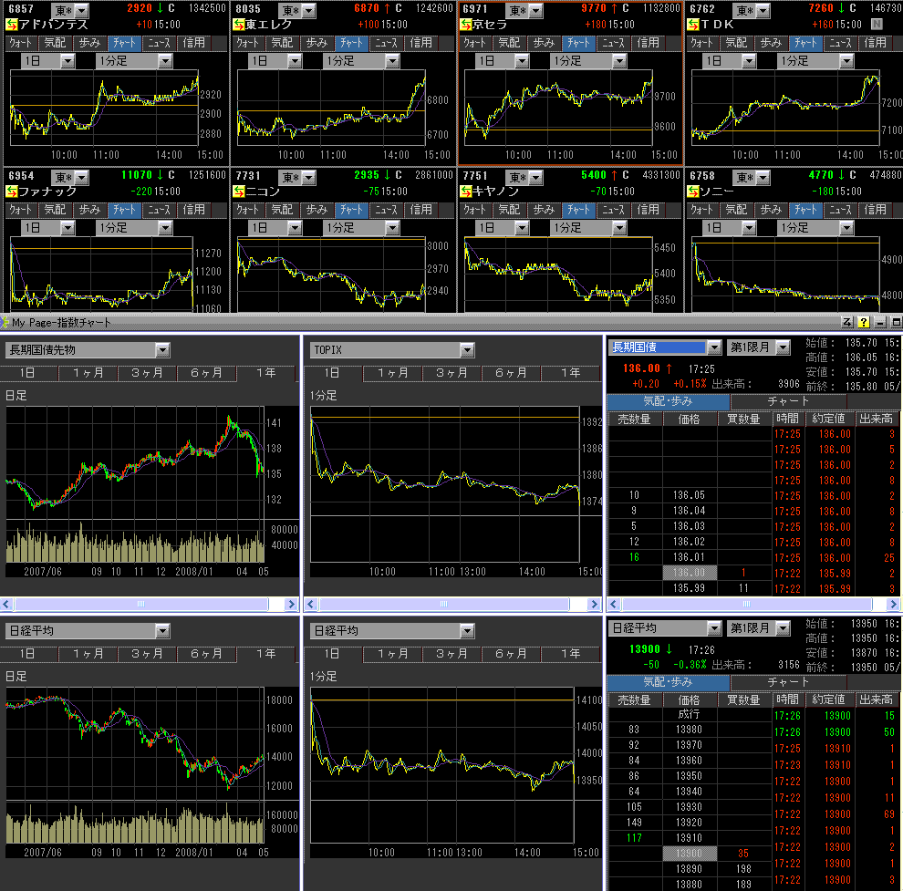 米株安を受けて、日経平均は反落。ザラ場は日経平均14000円弱のあたりをうろうろ。引けにバスケット売りが出てストンと落ちました。業種別では、米金融株安を受けて、銀行・証券が売られました。あと、値嵩株が高いのと安いのとがはっきり分かれていました。