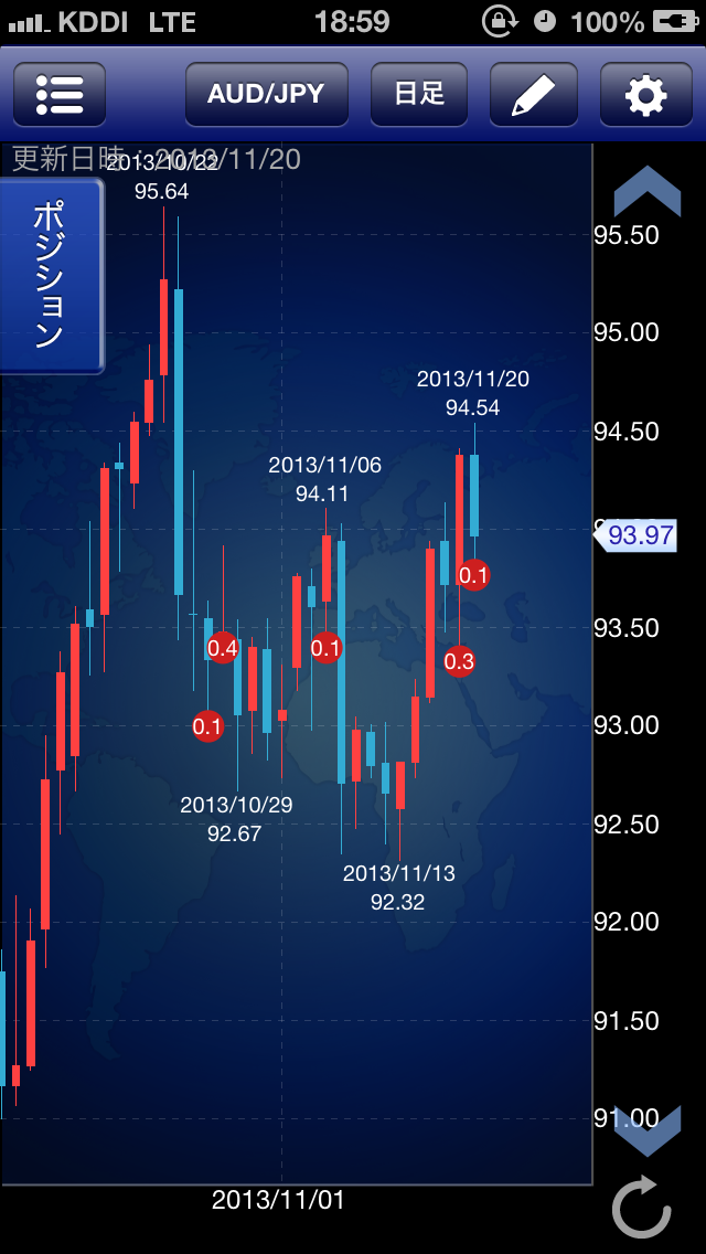 本日(2013/11/20 19時)時点で豪ドル円は94.00あたりまで戻ってきております。