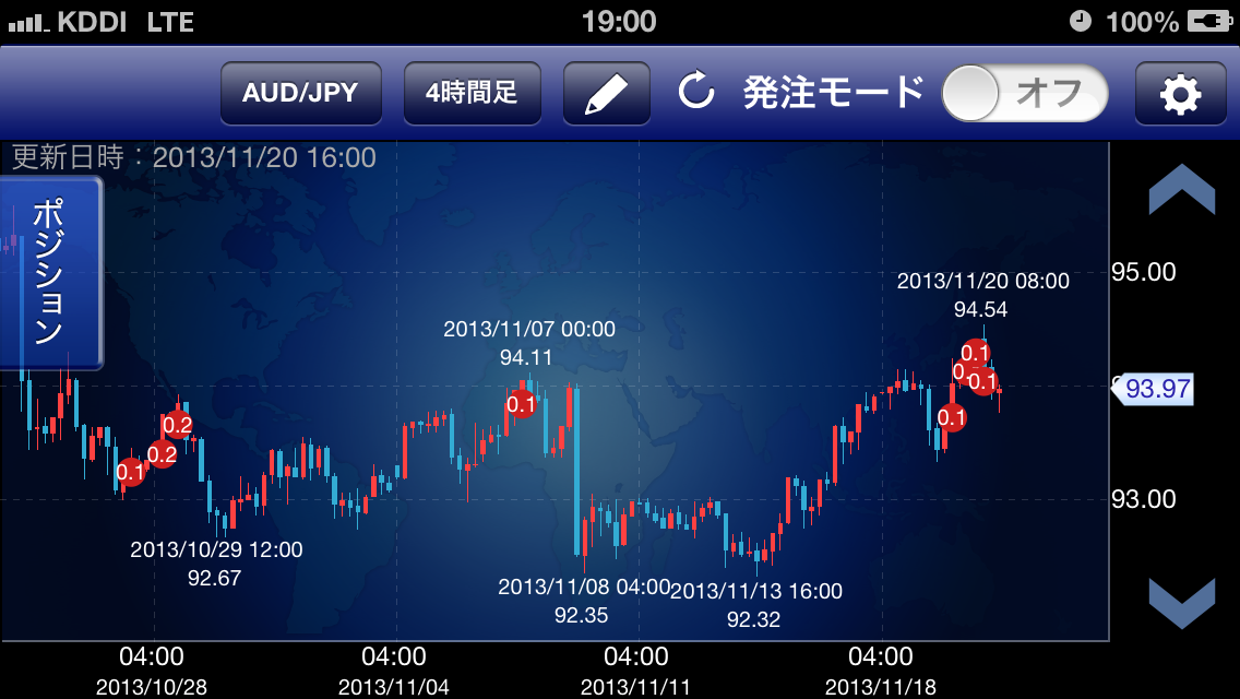 最初のポジション:10/25 93.55買い から12銭ごとに0.1万豪ドルをキレイに買い増していますね。