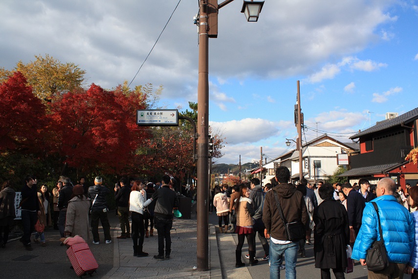 嵐電駅前通りは歩行者天国で車の進入禁止です。人が凄くて渡月橋も数珠つなぎでした。