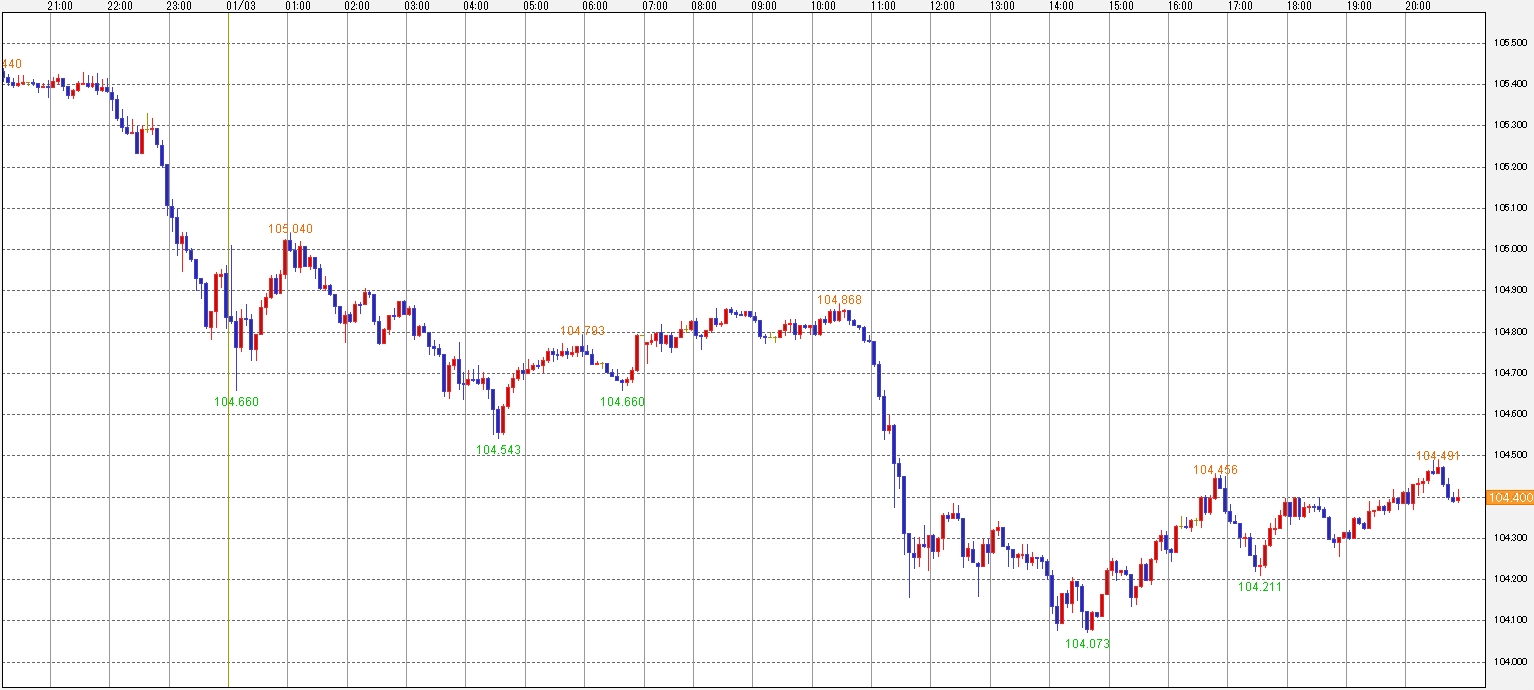 今日の東京市場は三が日で休場、東京時間帯は1ドル=104.00~104.80円台でNY市場に続いて大きく下押しされました。序盤は高値圏でのモミ合いでしたが、(中)12月非製造業PMIが4ヶ月ぶりの低水準となったことからかアジア株が大きく下落すると、それにつられる形でリスク回避の円買いが強まり、大きく値を下げました。