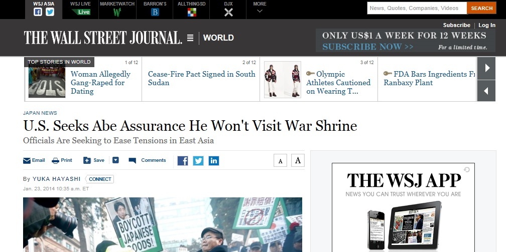そのうえ、欧米マスコミにいる日本人記者が欧米人向けに日本に非があるかのような記事を書いている(タイトルで靖国をWarShrineと書いてるので、これを見た欧米人には日本=悪者イメージになる。戦死者の慰霊、追悼の神社を戦争の神社とし、そこに首相が行くと書けば、それだけで日本=悪となる。 和訳のほうではWarShrineのニュアンスを消して中立記事を装ってるのでかなり狡猾)。
