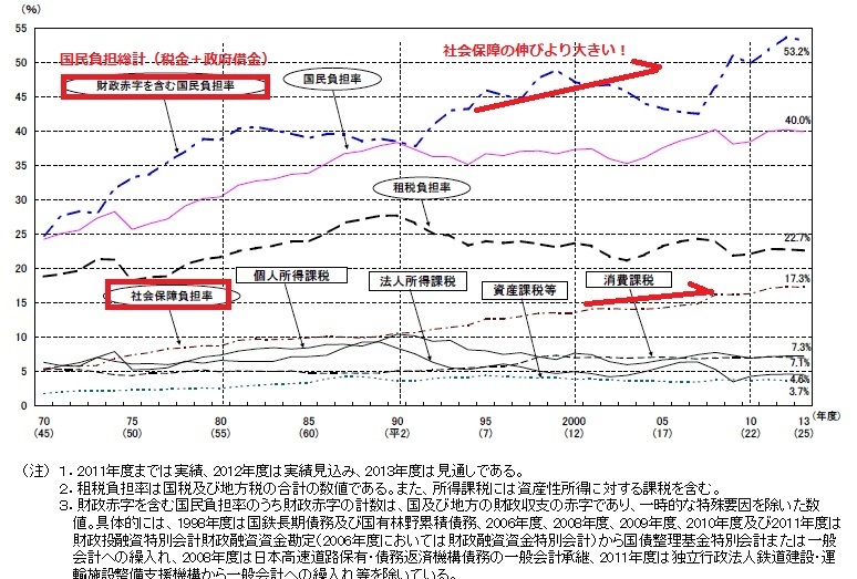 国民負担(税金+国債(国民借金))の増大では、社会保障関連の伸びよりも、全体の伸びのほうが大きいのです。 つまり、社会保障よりもそれ以外に使われるお金のほうが大きい。
