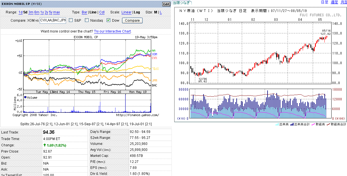 商品先物に流れ込んでるヤリスギマネーが、資源関連銘柄にも流れ込んでいる感じがします。画像1は5日チャートを比較したもの。XOM:エクソンモービル, CVX:シェブロン、AA:アルコア、JPM:JPモルガン、BAC:バンカメ、^DJI:ダウ平均。エネルギーセクターは時価総額が大きい銘柄が多く、それに加えてダウ平均で言えばエクソンとシェブロンはいずれも(おそらく)値嵩株なので、このセクターはダウ平均とS&P500への影響が大きいです。これ、もし原油価格が崩れたら、エネルギーセクターが売られて米株価指数も崩れるんじゃないでしょうか。