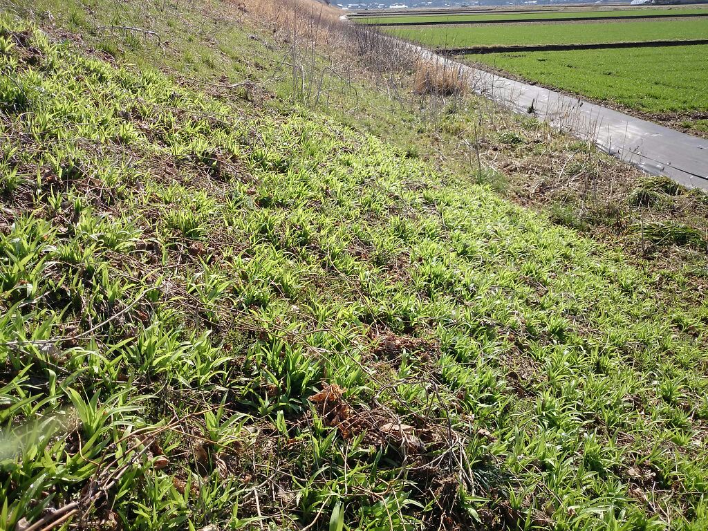 土手にはカンゾウの若い芽がびっしりと生えてます