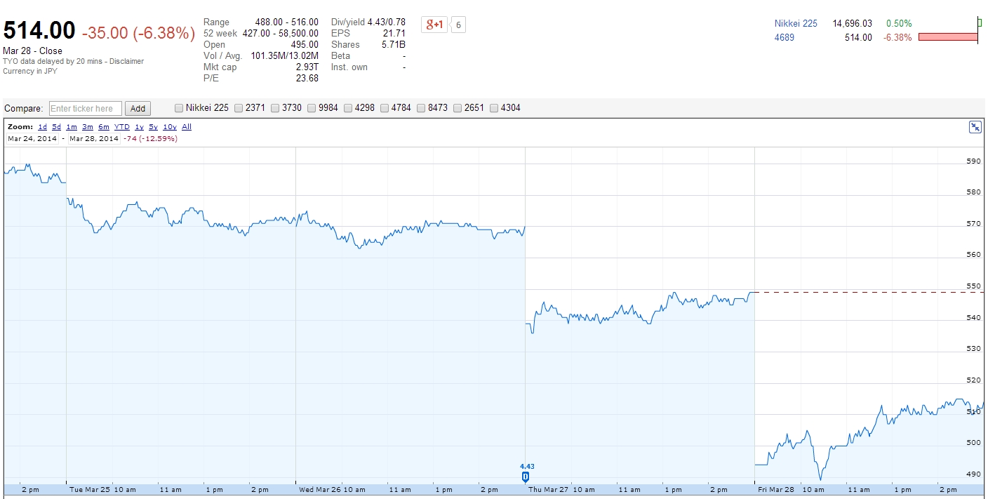 昨日の夕方からの記者会見で、国内ポータルサイト最大手のヤフーがイー・アクセス(+ウィルコム)をソフトバンクから3,240億円で買収し、通信(キャリア)事業への参入を発表しました。そして一夜明けての今日のヤフーの株価は昨年10月以来、5ヶ月ぶりとなる下落率を記録するなど大きく値を下げました。
