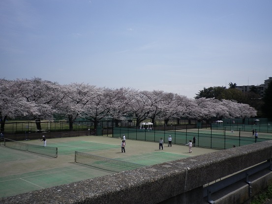 駒沢公園内の桜。春休みなので子供もいっぱい。テニスをやっているのは奥様方か中高年のオジさんばっか