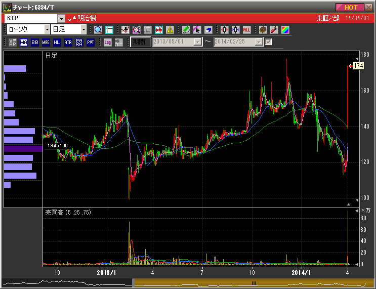 写真は6334明治機械のチャート。1日で40%の上昇。