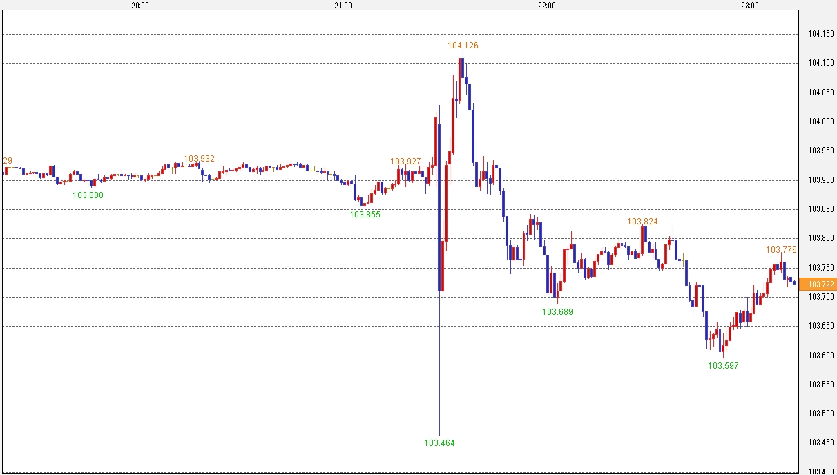 ↑発表直後のドル・円相場の値動き。大きく乱高下した後はジワ下げ。