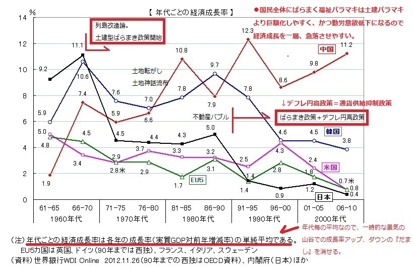 で、一部(多数?)のマスコミ、エコノミスト(日本のマスコミ、エコノミストは福祉拡大路線の左翼系(民主党系)や役所のポチがほとんど)を通じて喧伝されてる日本低成長論が、財務官僚たちが狙う金融緩和抑制=景気抑制政策を目くらましする援護射撃になってる。 マスコミ論説自体が財務官僚たちの宣伝(国民洗脳手段)になってる側面が大きい。