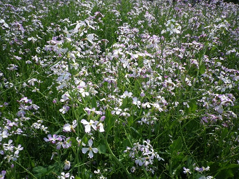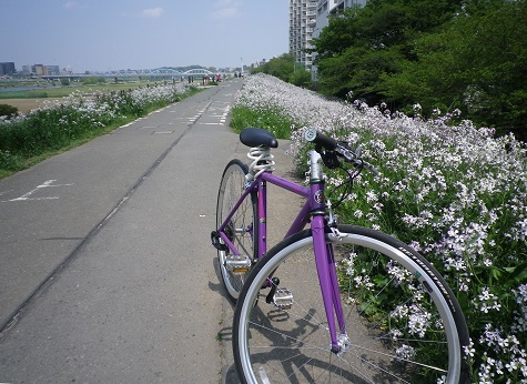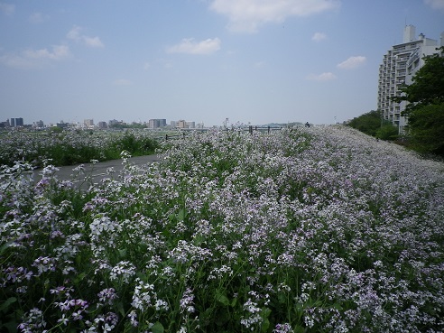 丸子橋からガス橋にかけて花(正体不明)が満開です。去年もあったのかな、覚えなし。