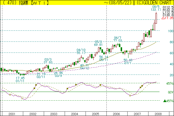 03/3から05/8の抵抗線が現在140ドル 98/12から07/1の支持線を00/9の高値に合わせた平行線が168ドル になっています。
