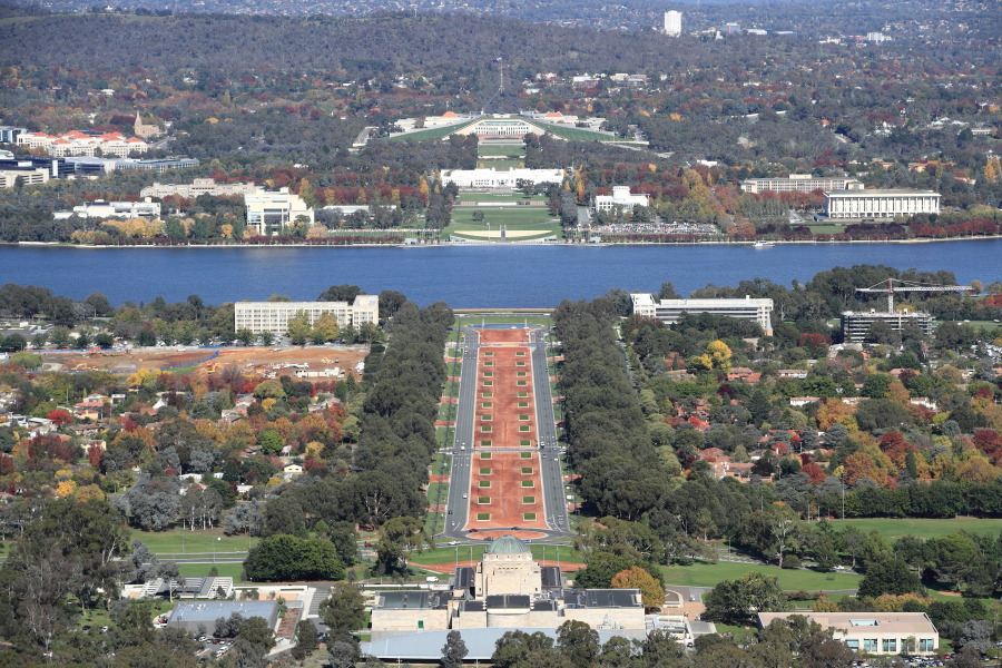 真ん中に見えているのがバーリーグリフィン湖で、キャンベラの水源地の一つです。湖の奥に見えているのが政治の中心地で、手前は商業地域に続きます。