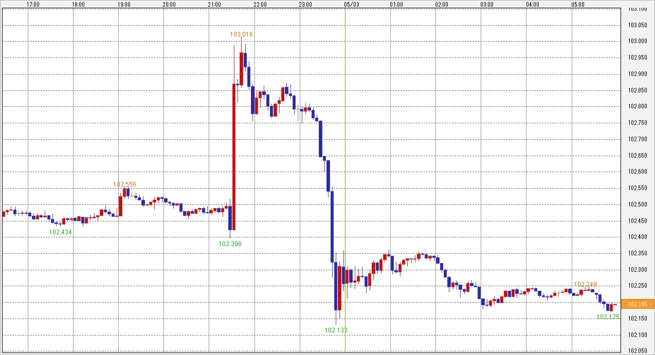 本当にこれ以上ない結果ですね。まさにパーフェクトというか・・・。でも、肝心の値動きはというと、発表直後に急騰して103円台に瞬間的に乗せたものの、重い売り注文の壁を貫けず・・・。最終的には発表前の水準より値を下げてしまうまさかの結果となりました。゚ヾ(´A`)ノ゚。ゥワァーン