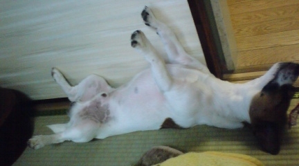 犬はこのスタイルが一番涼しいようですね。何度見ても笑っちゃいます。たまに毛布を上からかけてあげるとまるで人間ですよ(笑)