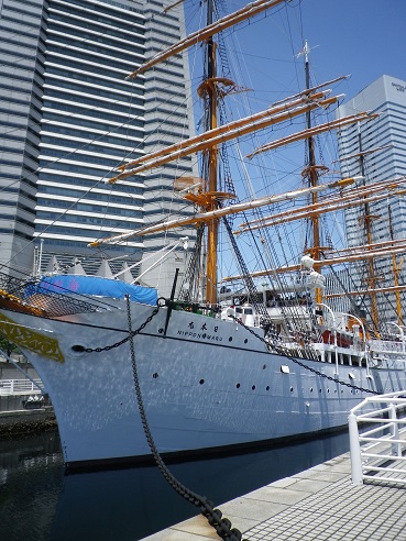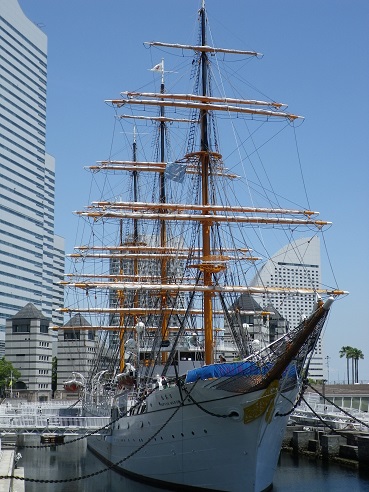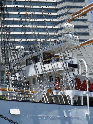 ↑みなとみらいにある日本丸。左のビルはクイーンズタワー。この辺は三菱造船だったかの跡地