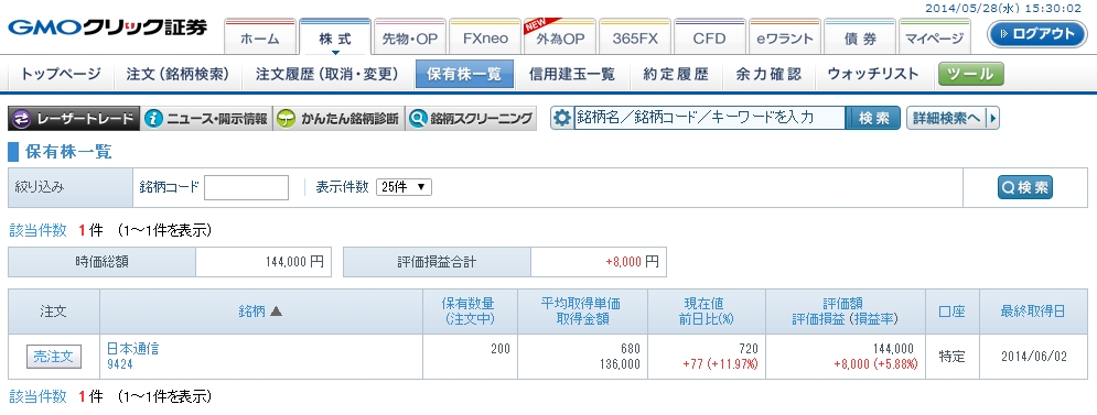 保有株状況@GMOクリック証券:含み損益+8,000円