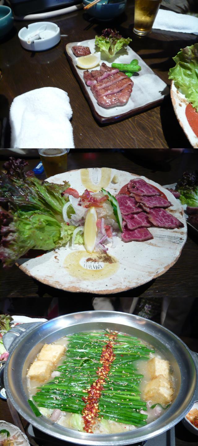 この辺りまでは前菜ですね~♪続いて牛タンのステーキ(写真中央上)、牛のタタキ(写真中央中)、そして!!メインのモツ鍋!♪(写真中央下)