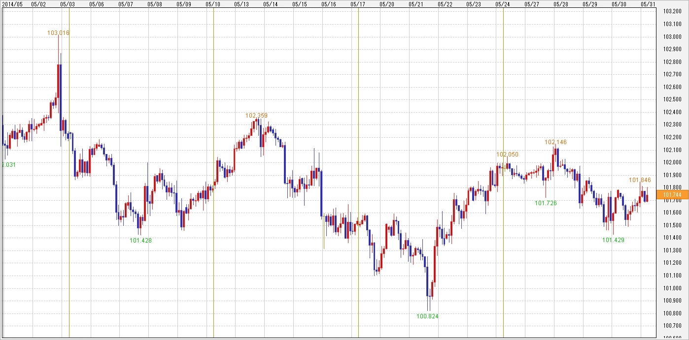 5月のドル・円相場は1ドル=100.82~103.01円での上下。