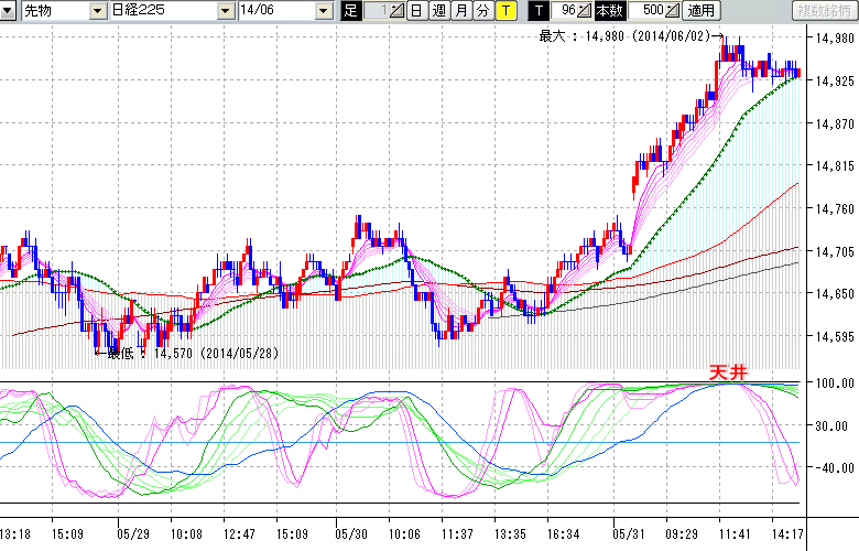 指標ラインの密集点が天底・転換点を示します。指標の見方