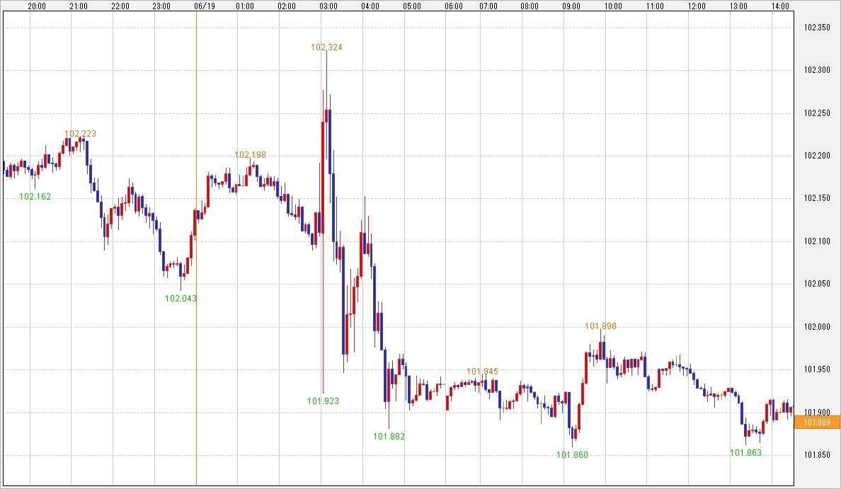 ドル・円相場の値動きとしては、発表直後は短期的な金利の上昇というのをみて強めの動きとなったものの、その後は今年の経済成長の下方修正、さらに長期的な政策金利見通しなどが引き下げられたことで反落という流れでした(´・ω・`)