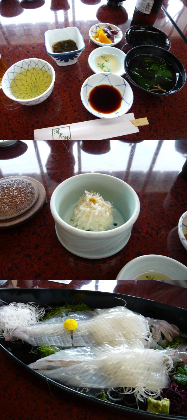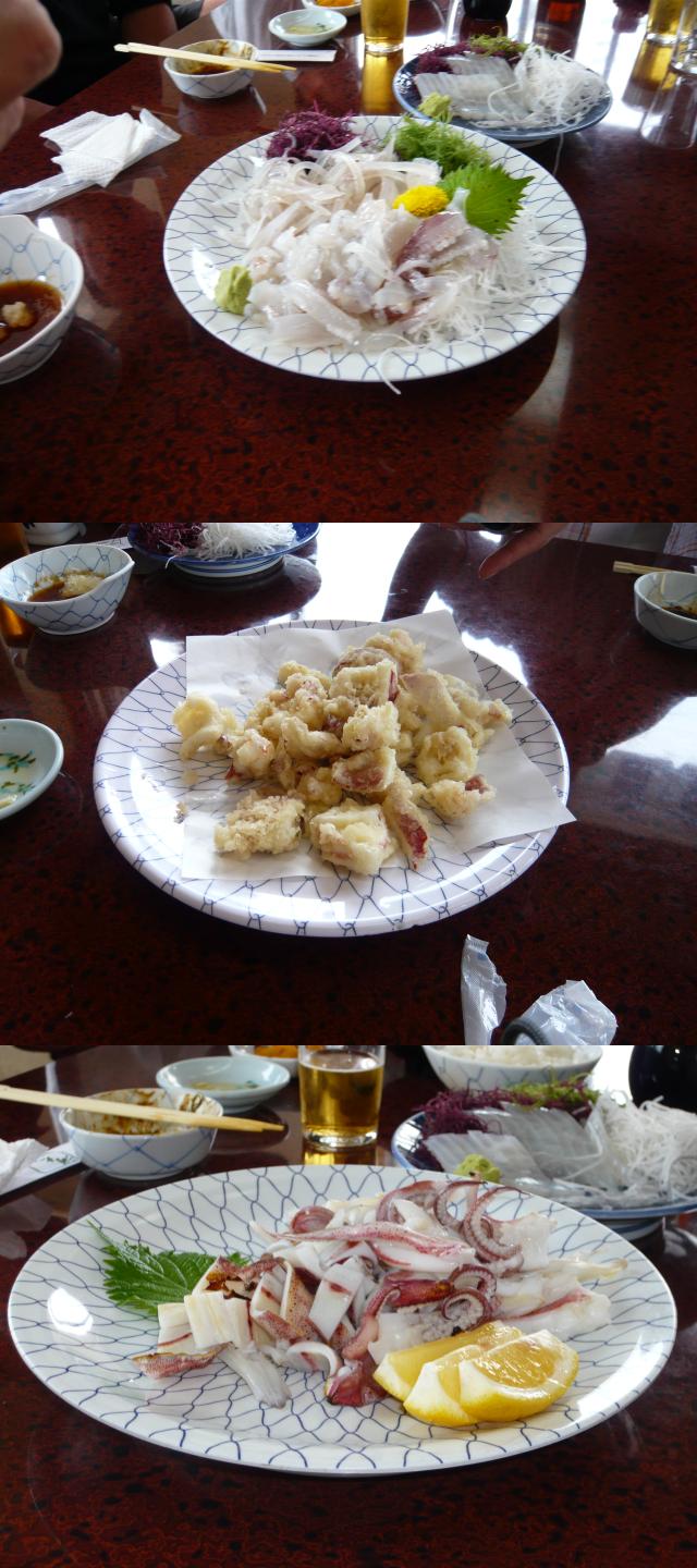 半身を食べた所で、残りの半分とゲソは、お刺身(写真中上)、天麩羅(写真中中)、塩焼き(写真中下)にしてもらいます。