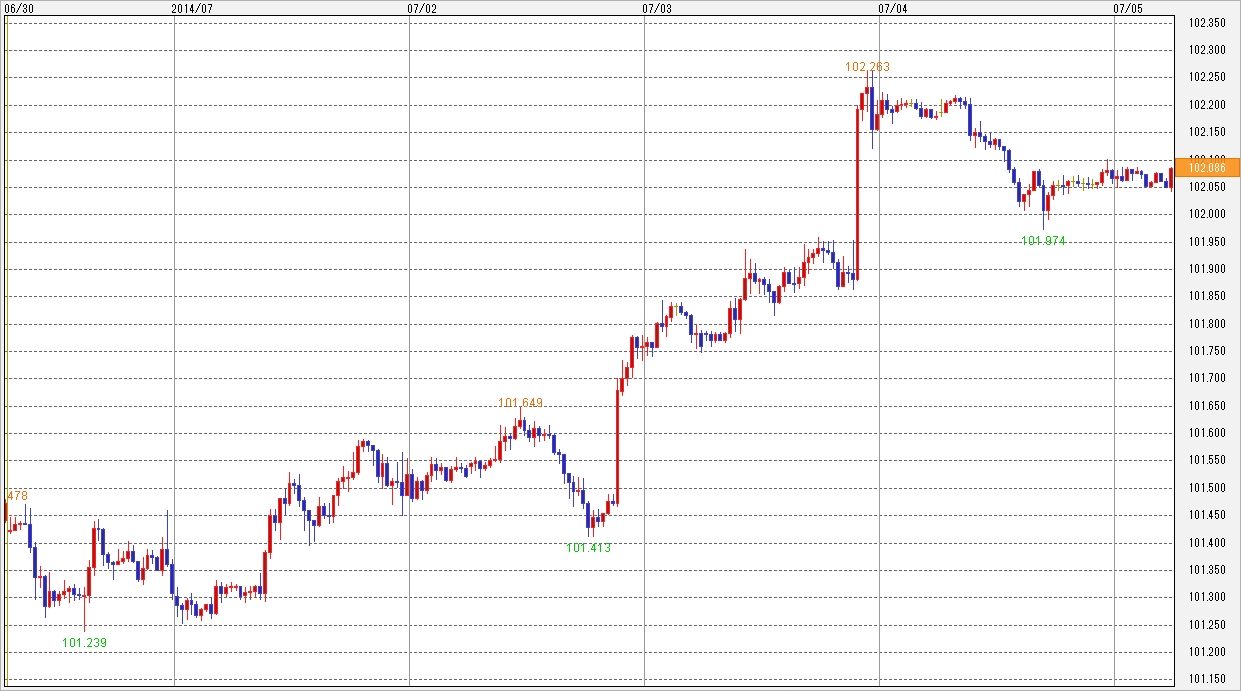 6月30日~7月4日の週。ドル円相場は1ドル=101.23~102.26円。