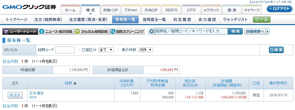 保有株状況@GMOクリック証券:含み損益+266,000円