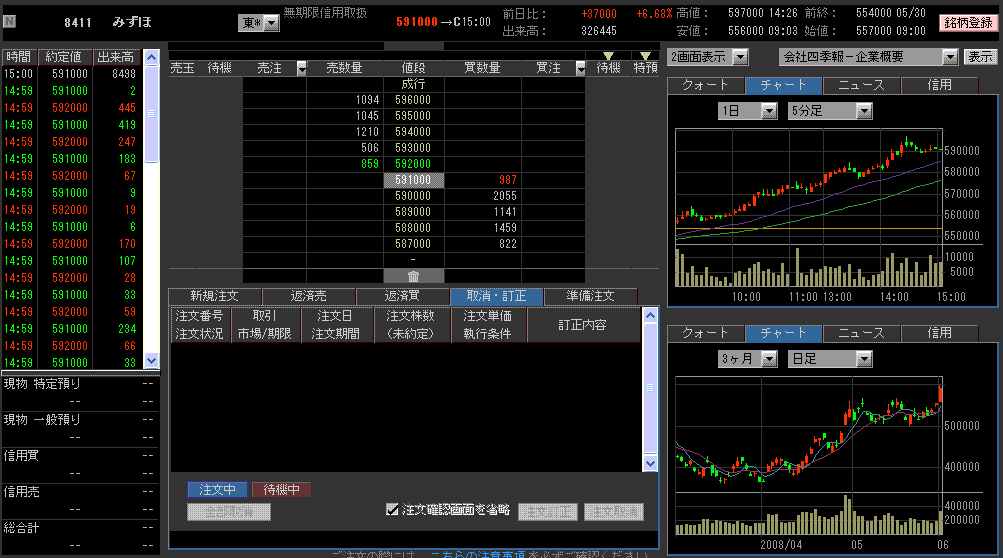 今日は、長期国債先物が134円を割れたことによって、ブレイク狙いの新規建てとブレイクされたことによるロスカットが入った感じです。それがペアトレードの形で株先物にも影響が出たと。それなりに現物にも買いが入っているんでしょうけど、ここ三日間の上昇は、先物の影響が強すぎてどう判断してよいか迷いますね。