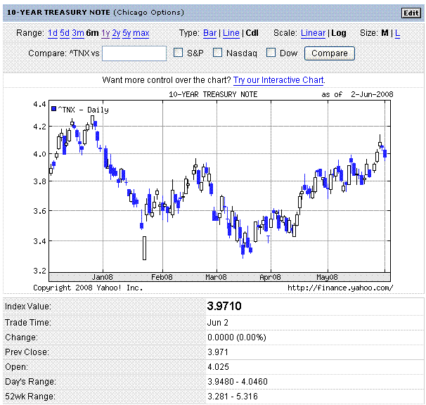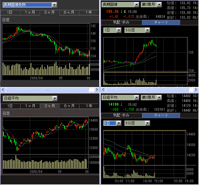 長期金利は4%割れ。ファンダメンタルズはやっぱ悪いねという雰囲気になって、しばらくの間は株も商品も低迷するのが実体経済にとっては良いのでしょうね。まあ、金余りのようなので、なかなかそうはならないでしょうけど。日本も、国内景気が良くないのに長期金利が上がってきています。