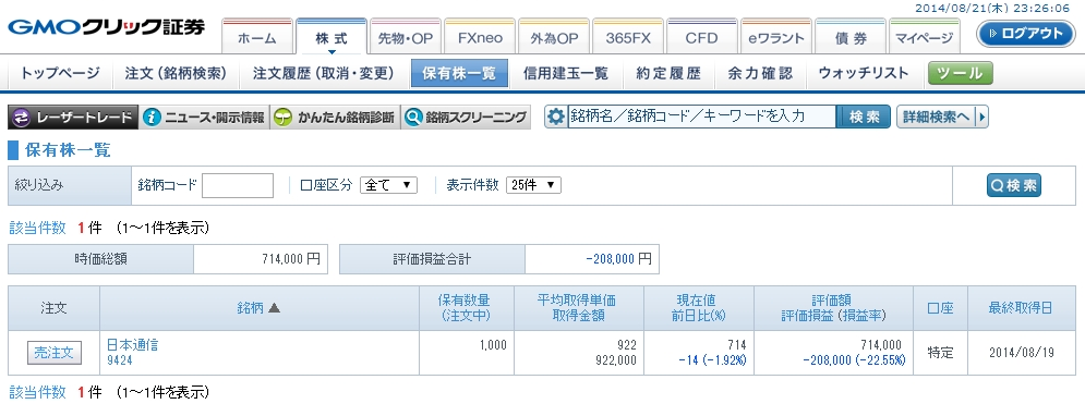 保有株状況@GMOクリック証券:含み損益-208,000円