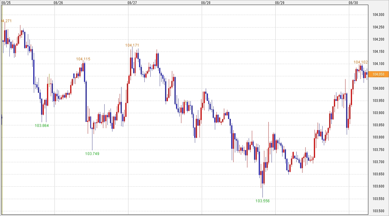 ↑8月25日~8月29日の週。ドル円相場は1ドル=103.55~104.27円。