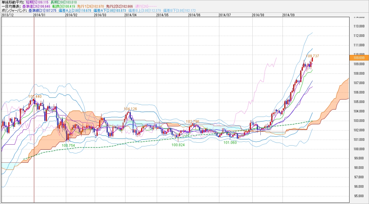 チャートを見る限り、先週こそ110円を目前にやや足踏みしたものの今週は上昇スタートとなっています。テクニカル的には、200日移動平均線ははるか下にありますが、ここ最近は5日移動平均線に添う形での上昇となっています。