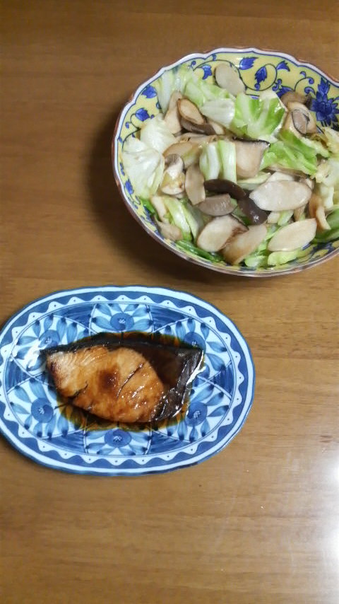 ぶりの照り焼きは、絶対に失敗しない拙者の鉄板料理。付け合せはエリンギとキャベツの炒め物に致した。(それにしてもきのこ好き…)
