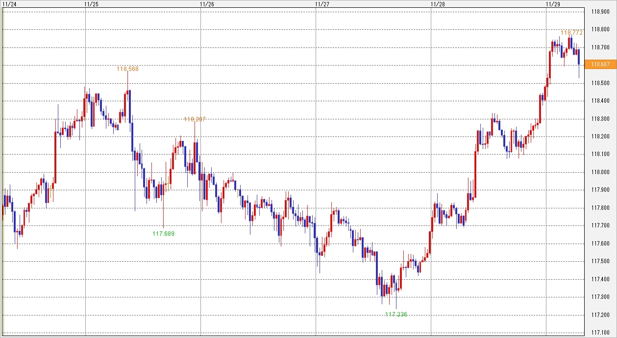 24日の東京市場はは勤労感謝の日(祝日)で休場(つ∀-)オヤスミー アジア時間帯は、1ドル=117.50円~118.00円台でやや大きめの上下だった。序盤は利益確定の売りに押されたのか反落。ただ、その後は前週に中国が利下げを発表したことによってアジア株の堅調推移し、これに伴ってドル・円もジワジワ上値を伸ばして118円台にタッチした。