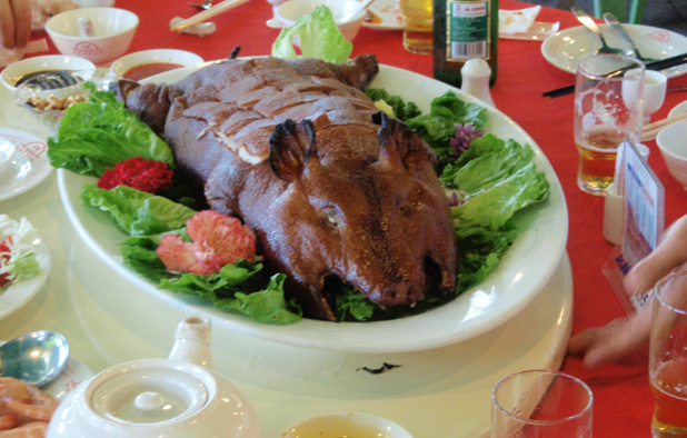 仔豚の丸焼きは、見かけよりは全然普通の味です。偏食がちな私も食べられましたから(^^;でも、この容姿ですから、女性はキツイかも知れませんね。よく考えたら「丸焼き」って名前もすごいです(笑)