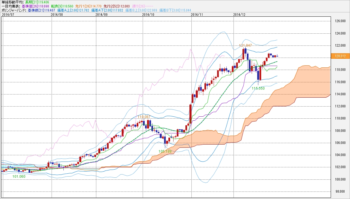 基本的に下値は目先で節目の120.00円ライン、その下に21日線の119.40円、一目の基準線が118.70円に控えています。これらがサポートとなるので底堅い相場が続きそうですが、何らかの要因で118円台にあある一目基準線を割り込むようだと相当目先は怪しいので要注意です。