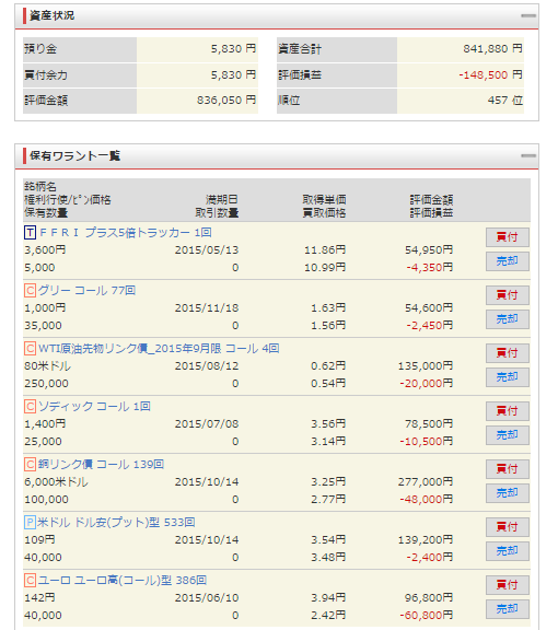 ワラントはだいたいそんなもんです。思惑とちょっとでもはずれれば、3円とかのある程度価格の高いワラントでもあっという間に、叩かれますね。ましてや、1円以下ので勝負ではずすと、、、一瞬で財産すべて消えます。株で使うお金を200として、ワラント1くらいで、ピンポイントでやるくらいか、やらないくらいでいいと思いますね。ワラントは相場が盛り上がった後の、どうでもいい相場のときにワラント対象銘柄に新設されるので、設立後数年は儲けるのが至難なワラントが一般的には多いですね。画像の例だと、ソディック、FFRIみたいな。