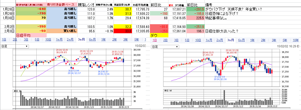 ダウの上昇で安心して買いこんだ人もいたはず。しかしチャートを見ると大きな陰線。流れの中からの位置を見ても下に行きそうか。ここで踏ん張ったら逆に、そうとう難しい、裏をかく相場だってことだ。空売り比率もぐんと上がった。仕掛けが入ったし。