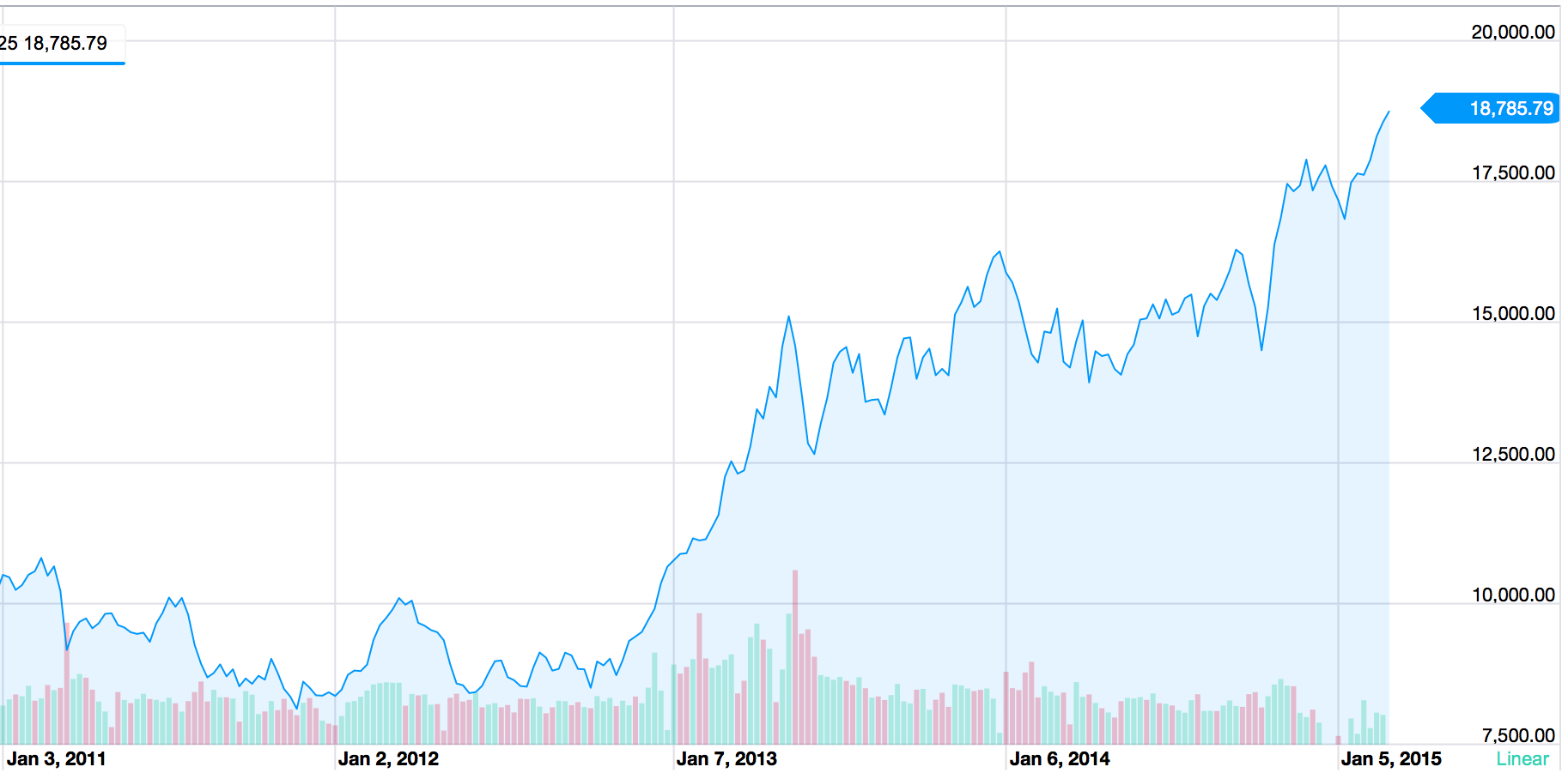 そんなわけで、今日の日経平均株価は前日比+200.50円高の18,785.79円で終えて、2000年4月20日以来となる約15年ぶりの高値をつけています。