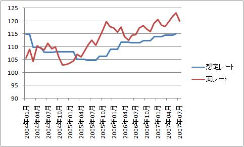 添付の図は、僕が作成したドル/円の実レートと企業(全産業)の想定レートの推移です。